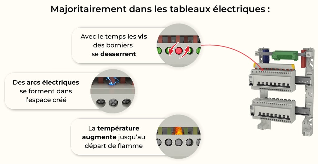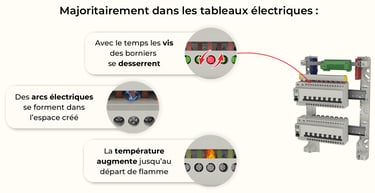 La plupart des départs de feu d’origine électrique naissent très précisément dans les tableaux et coffrets électriques : au fil du temps, les connexions se desserrent, les bornes chauffent, et un arc électrique peut apparaître dans l’un des espaces libérés. Cette surchauffe lente finit par déclencher un départ de flamme.
